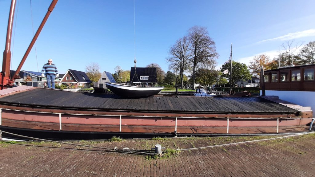 Onze Tukkervlet “Kleintje” is door de vrijwilligers flink onderhanden genomen, schoongemaakt en weer voorzien van een frisse verflaag. De vlet staat in het laadruim en kan met behulp van de eigen laadboom aan dek of in het water worden gezet.